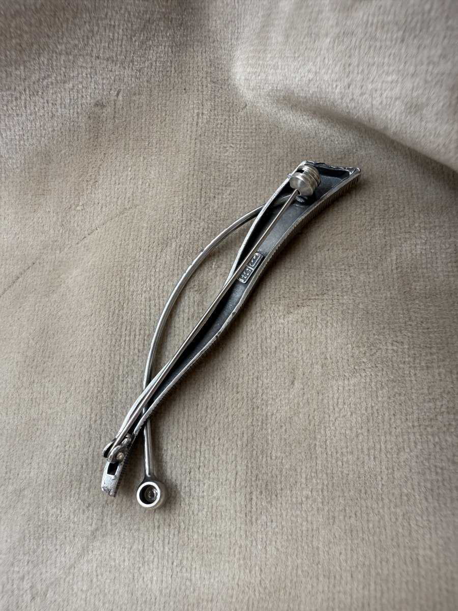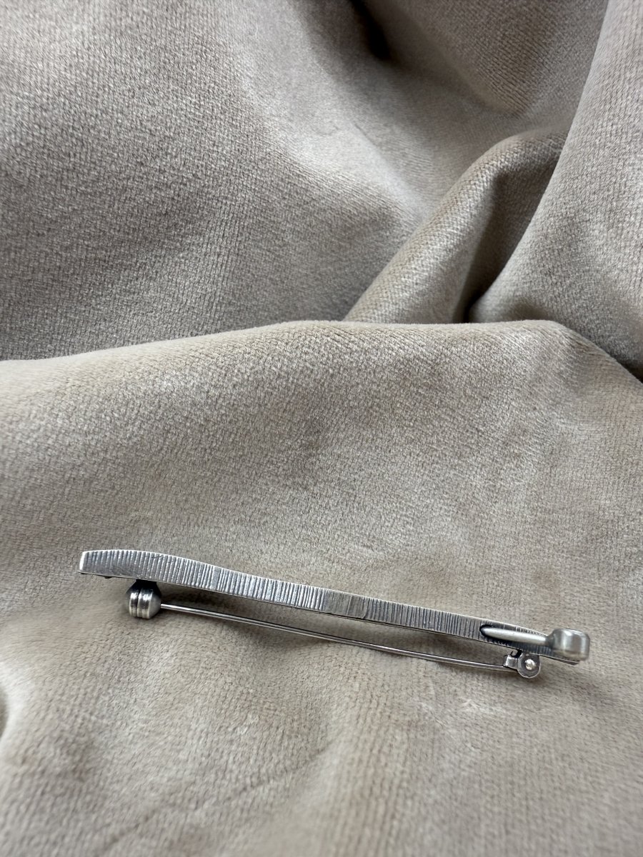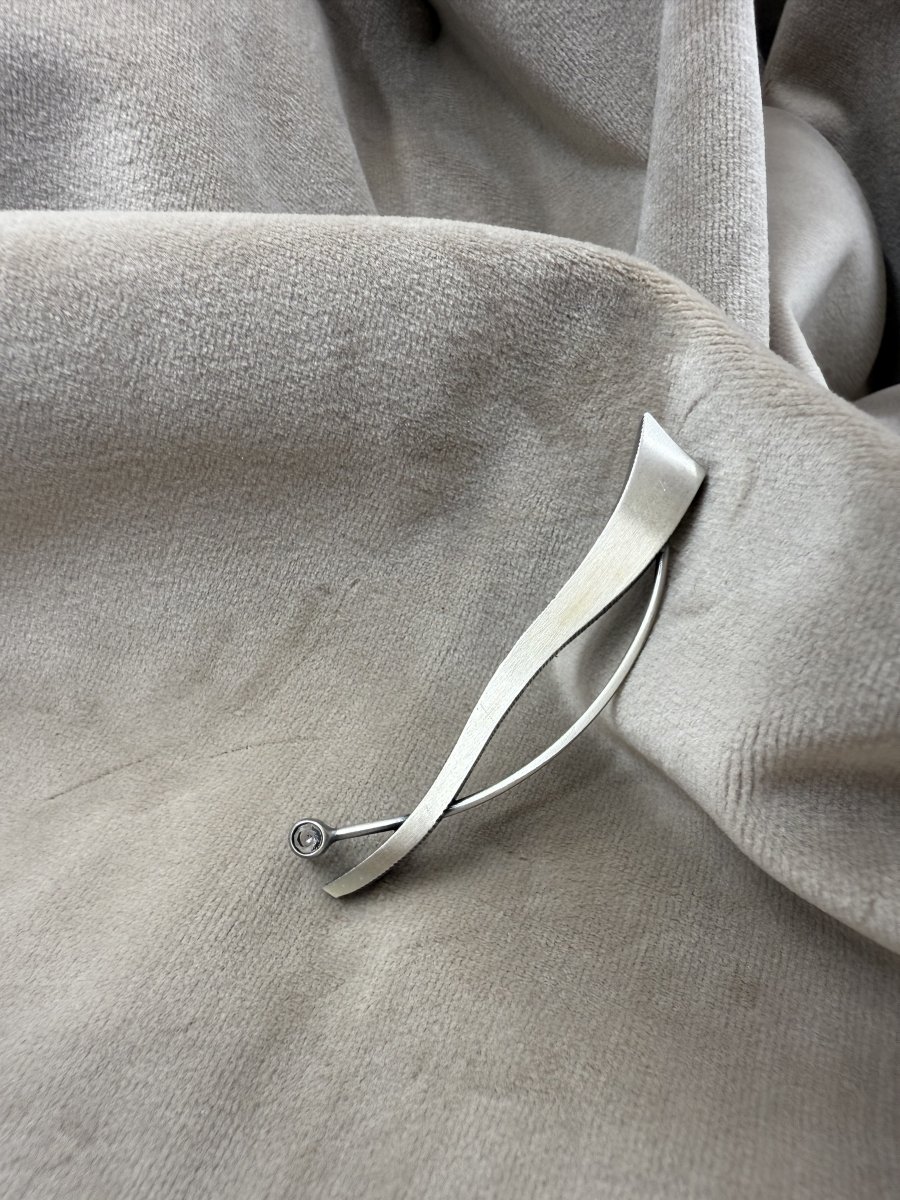 En silverbrosch från Finnfeelings. Broschen har Finnfeelings karaktäristiska matta yta och randiga sidor.