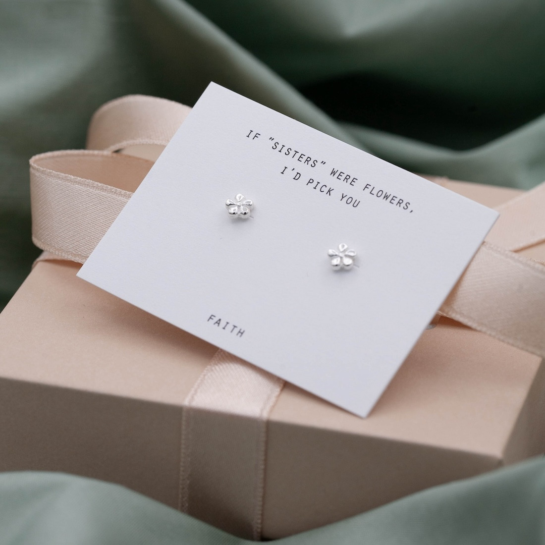 Örhängena kommer med ett kort med texten: If "sisters" were flowers, I'd pick you.