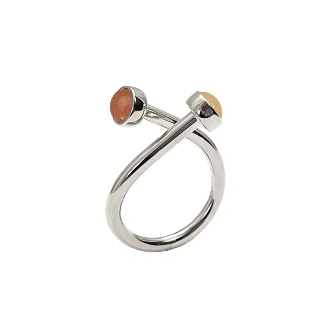 En lekfullt minimalistisk ring med två stycken 5mm stora ädelstenar i en rödgul mix.