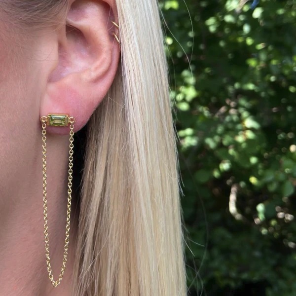 Modellen på bilden bär samma örhängen fast med stenen Peridot.