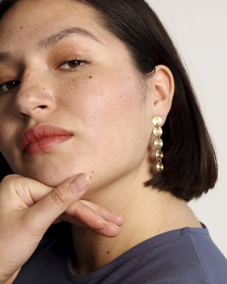 Imponerande i sin enkelhet levererar de långa Kosmos-örhängena en iögonfallande fokuspunkt för din outfit. Stiftfäste på den översta rondellen.