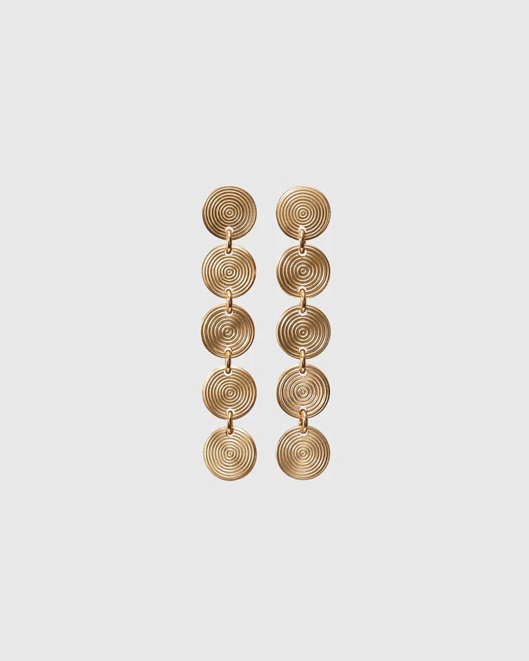 Produktbeskrivning:De femdelade Kosmos örhängena är gjorda av brons som glöder som guld. De runda bronsdelarna hänger ihop i varandra med små öglor och är mönstrade på båda sidor.