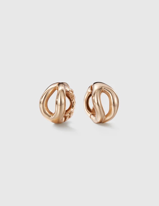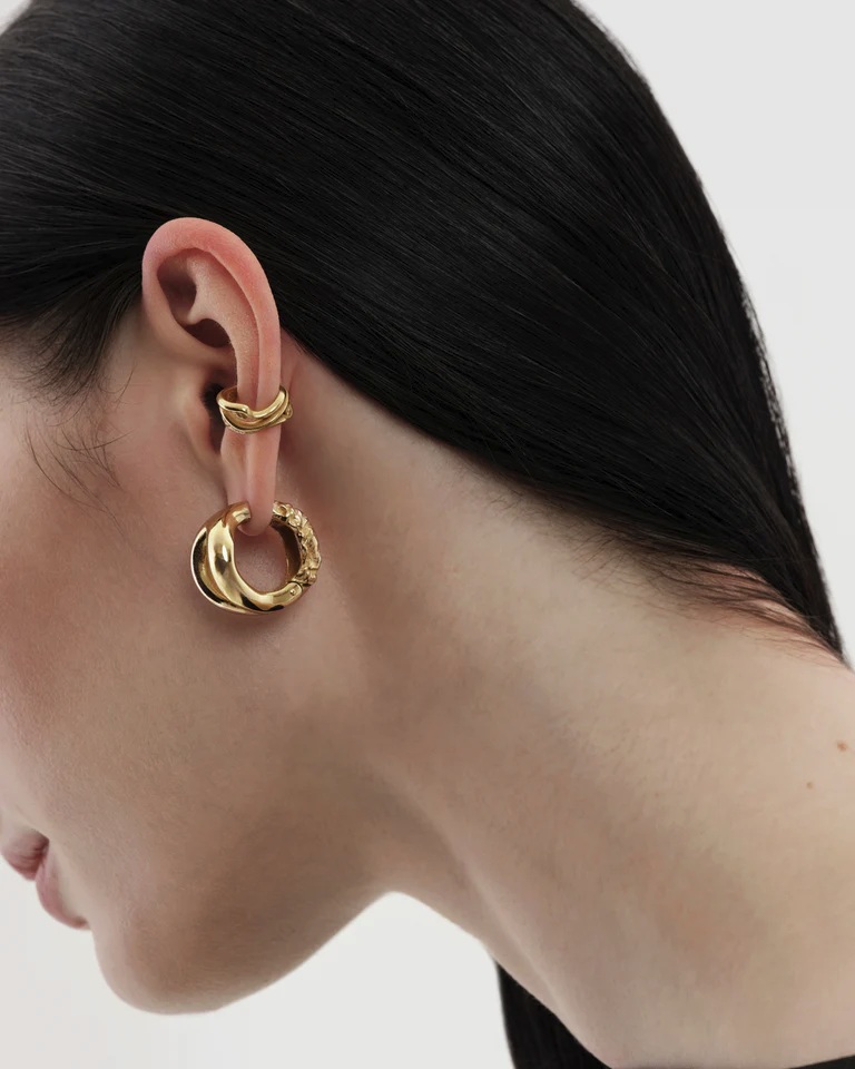 Den taggiga strukturen på ena sidan av örhänget skapar en skarp kontrast till den släta, mjukt böljande ytan. Den taggiga strukturen är antingen synlig eller dold beroende på vilket öra du bär örhänget på.