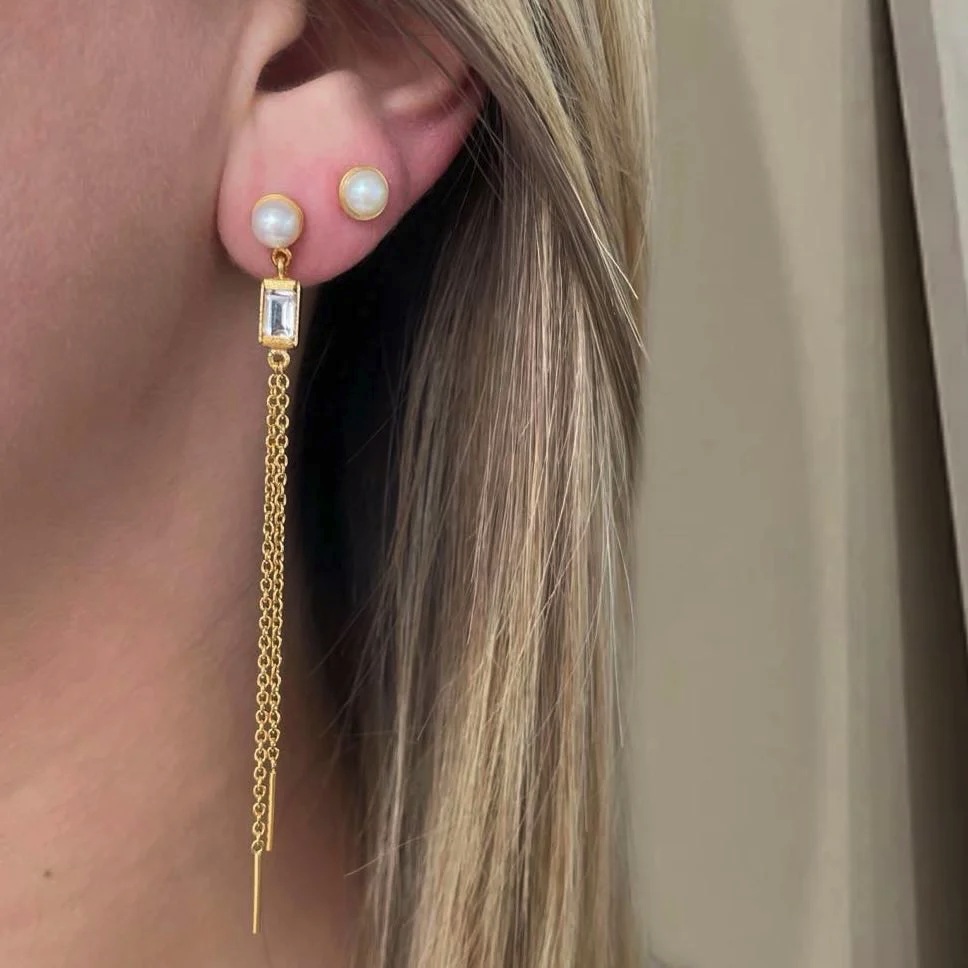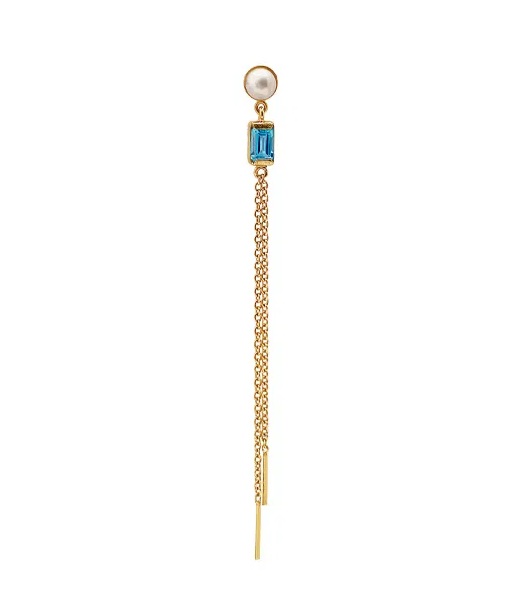Ett örhänge med pärla, blå topas och två långa kedjor i förgyllt silver. Ett elegant statement i örat, kanske tillsammans med fler pärlor om du har fler hål.